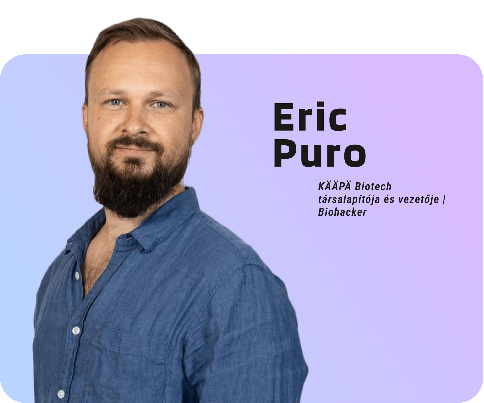 Eric Finnországból érkezik hozzánk, hogy megossza a tapasztalatait a magyar közönséggel. Vállalata, a KÄÄPÄ Biotech permakultúrás erdőgazdálkodást folytat Finnországban. A világ legtisztábbnak mondott erdeiben termesztenek adaptogén gombákat, amelyeket speciális eljárással kivonatolnak és kutatják a fiatalság megőrző hatásukat.